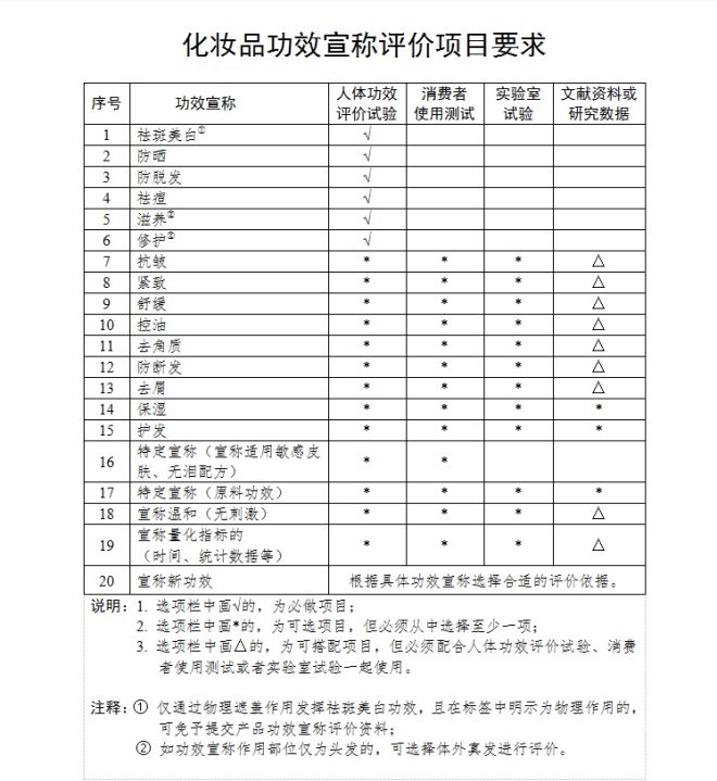 根據(jù)今年4月份,國家藥監(jiān)局發(fā)布的《化妝品功效宣稱評(píng)價(jià)規(guī)范》,共規(guī)定了20種化妝品功效宣稱的評(píng)價(jià)項(xiàng)目要求。