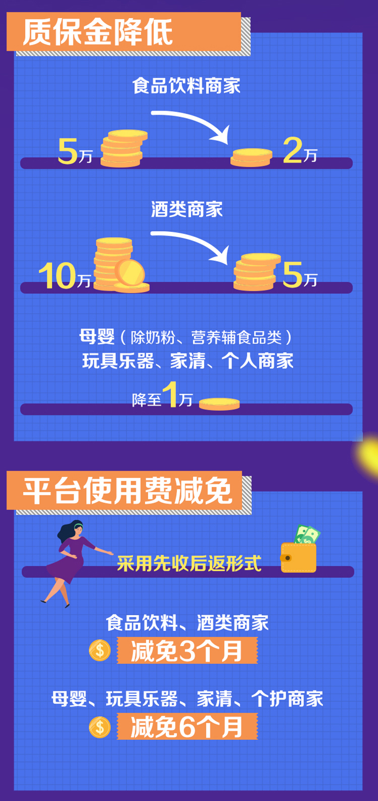在降低商家運(yùn)營成本方面,為降低商家資金占用,京東超市推出“質(zhì)保金降低”政策。食品飲料商家質(zhì)保金從5萬降至2萬,酒類商家質(zhì)保金從10萬降至5萬,而母嬰(除奶粉、營養(yǎng)輔食品類)、玩具樂器、家清、個(gè)護(hù)商家質(zhì)保金僅需1萬。