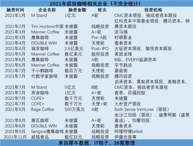 便利店品牌、新茶飲品牌、快餐品牌都在投資咖啡賽道,騰訊、美團(tuán)龍珠、字節(jié)跳動(dòng)、嗶哩嗶哩等也都相繼入局。