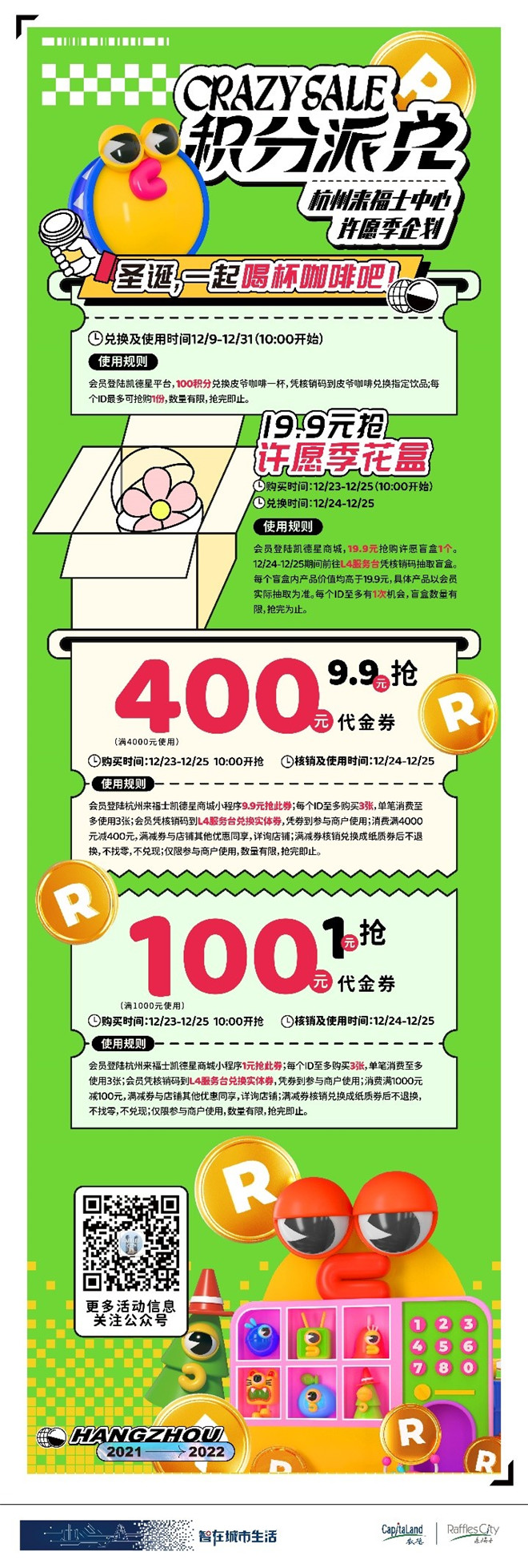 12月23日—12月25日,凱德星會(huì)員登陸杭州來福士中心凱德星商城小程序以9.9元搶購(gòu)滿4000元減400元滿減券一張,每個(gè)ID最多可購(gòu)買3張,數(shù)量有限,搶完即止。