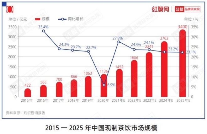 《中國餐飲品類與品牌發(fā)展報告2021》數(shù)據(jù)顯示,2020 年現(xiàn)制茶飲市場規(guī)模1136 億元,預計到2025年將達到人民幣3400億元,復合年增長率為24.5%。