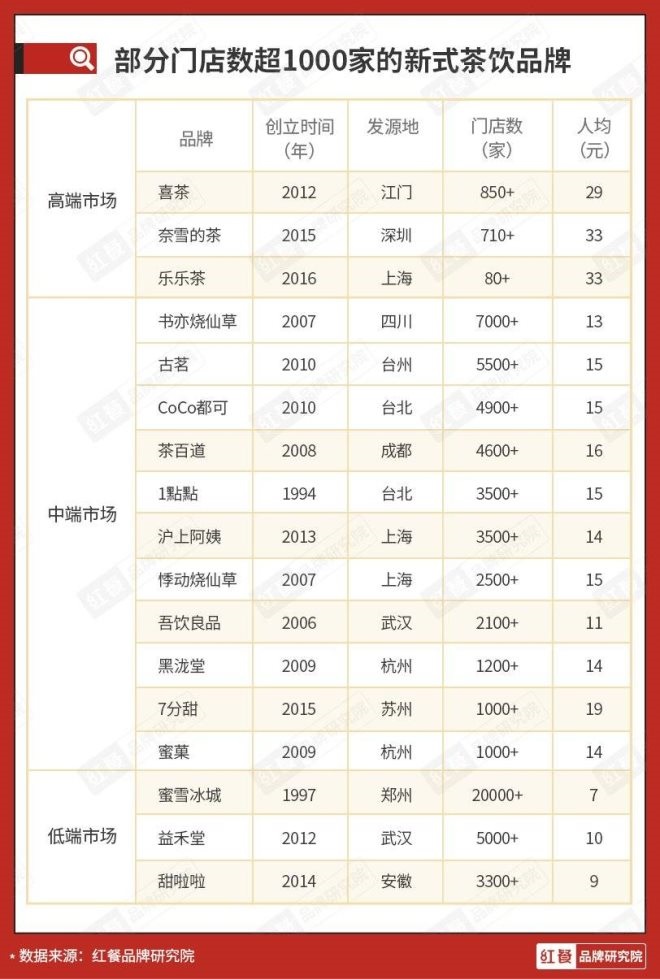 一般來說,根據(jù)人均消費位價,新式茶飲市場大體可劃分為高中低三個層級市場,高端市場人均消費在20元以上,以喜茶、奈雪的茶、樂樂茶為代表;中端是人均10~20元,市場占比最大,代表品牌也最多,比如1點點、CoCo都可、書亦燒仙草、古茗等;低端為10元以下,蜜雪冰城、益禾堂等。