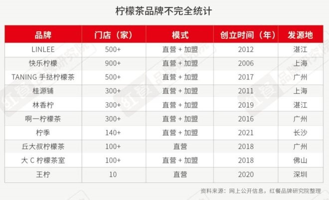 紅餐品牌研究院數(shù)據(jù)表明,門店數(shù)過百家的檸檬茶品牌達到了9個,門店數(shù)最多的快樂檸檬接近1000家,桂源鋪門店數(shù)突破300家,后起之秀LINLEE門店數(shù)也突破了500家。