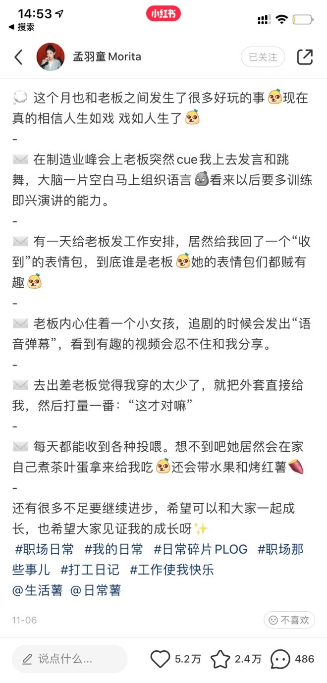 孟羽童入職后在小紅書上的分享,主要聚焦職場穿搭、職場工作小技巧、陪同出差、參加論壇、媒體采訪等方面,沒有涉及所謂的核心業(yè)務(wù),但活脫脫成了格力的新品牌代言人。