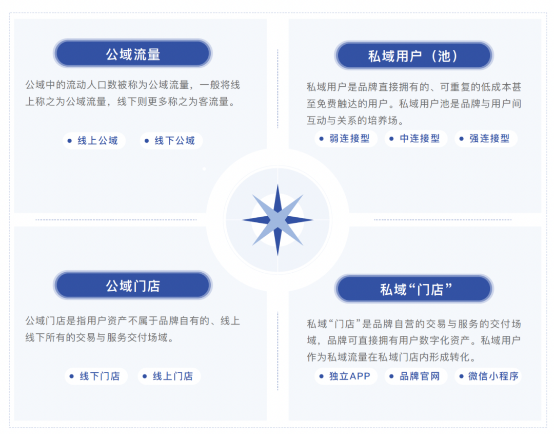 在這個關(guān)鍵窗口期,如果不厘清相關(guān)概念及其價值,品牌商家將難以明確投入重點,進而建立和不斷完善全域經(jīng)營體系,促進生意的可持續(xù)增長。為此,《指引》對公私域全局發(fā)展進行了系統(tǒng)化梳理,首次對“公域流量”“私域用戶池”“公域門店”“私域門店”等核心概念的內(nèi)涵、外延及價值作了明確定義。