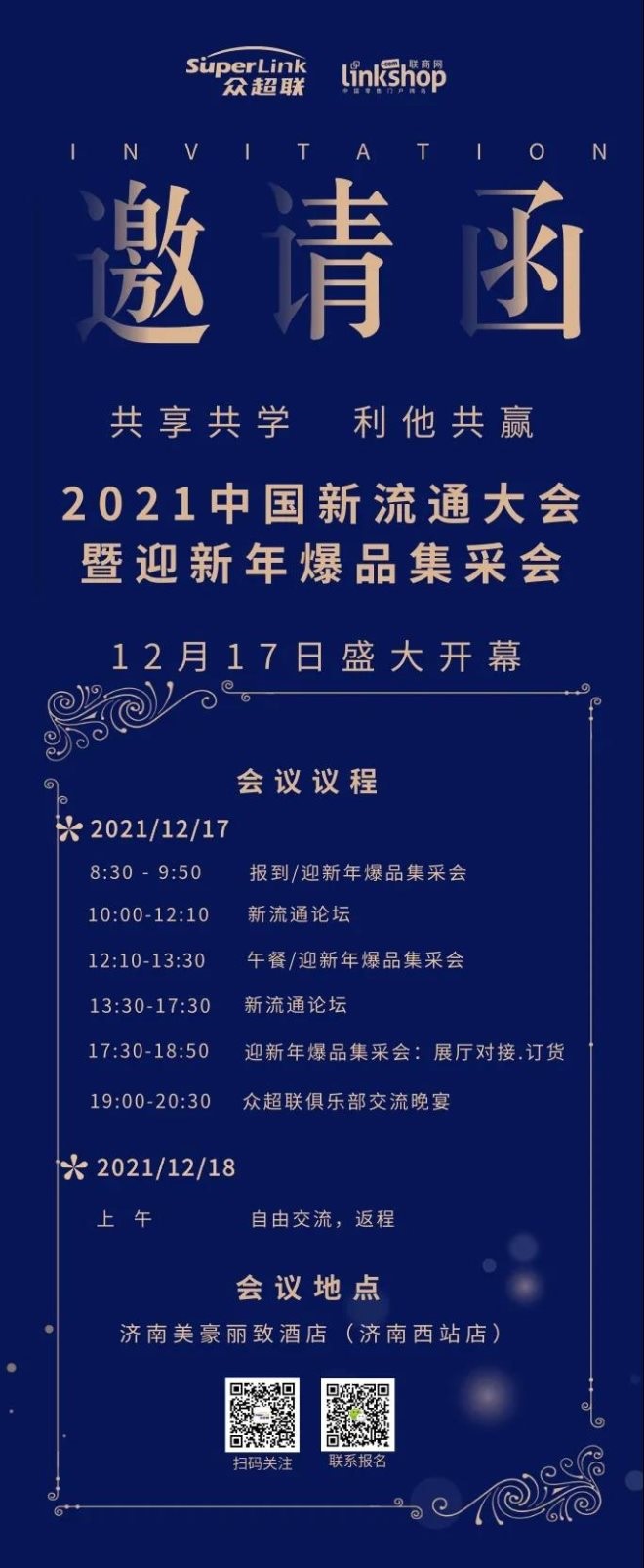 本次會(huì)議以“共享共學(xué) 利他共贏”為主題,屆時(shí)來(lái)自山東、江蘇、河南、河北、安徽等數(shù)百家零售精英、品牌廠家、供應(yīng)鏈機(jī)構(gòu)、數(shù)字專家、流通專家將匯聚一堂,共同探討中國(guó)新流通時(shí)代的發(fā)展與未來(lái)。