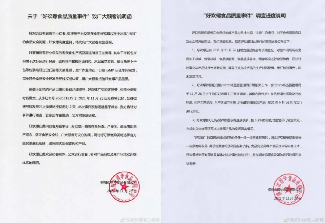 “蟲(chóng)卵事件”后的兩天,“好歡螺 蟲(chóng)卵”“好歡螺回應(yīng)”的話題登上熱搜后,11月28日凌晨,好歡螺才發(fā)布聲明,稱自身生產(chǎn)流程完全符合食品安全標(biāo)準(zhǔn)且經(jīng)權(quán)威認(rèn)證,并“硬氣”地表示將針對(duì)事件進(jìn)行核查,“若幕后存在推動(dòng),將依法維權(quán)”。