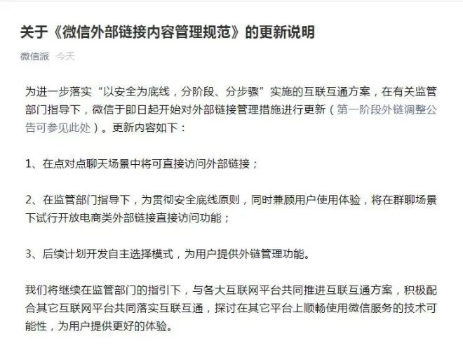 隨后在9月17日,微信公布了第一階段互聯(lián)互通措施。自9月17日起,用戶升級最新版本微信后,可以在一對一聊天場景中訪問外部鏈接。群鏈接因涉及廣大接收方用戶,暫時不開放外部鏈接。