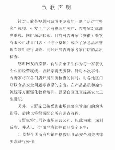 吉野家為使用發(fā)臭肉致歉:公司被約談,涉事門店停業(yè)整頓