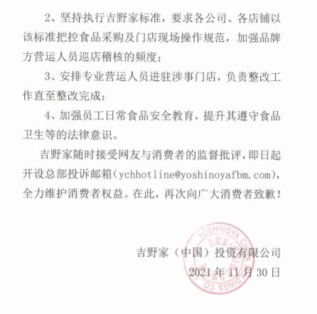 11月30日,吉野家(中國)投資有限公司在其官網(wǎng)就使用過期食材一事發(fā)布致歉聲明稱,涉事門店吉野家(安徽)餐飲有限公司已停業(yè)整頓,公司成立了緊急品質(zhì)管理專項組進行調(diào)查,同時開展吉野家各家門店的品質(zhì)檢查。吉野家已安排專業(yè)營運人員進駐涉事門店,負(fù)責(zé)整改工作直至整改完成。此外,聲明提到,公司已接受到市場監(jiān)督主管部門的約談指導(dǎo),后續(xù)將配合所有調(diào)查流程。