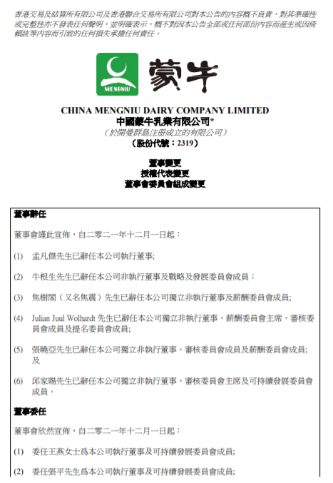 與此同時,蒙牛還宣布了一系列的董事委任。該公司董事會在公告中宣布,自2021年12月1日起:委任王燕為公司執(zhí)行董事及可持續(xù)發(fā)展委員會成員;委任張平為公司執(zhí)行董事及可持續(xù)發(fā)展委員會成員; 委任王希為公司非執(zhí)行董事及戰(zhàn)略及發(fā)展委員會成員;委任葉禮德為公司獨立非執(zhí)行董事、審核委員會成員、提名委員會成員及薪酬委員會成員;委任李恒健為本公司獨立非執(zhí)行董事、審核委員會主席、提名委員會成員、薪酬委員會成員及可持續(xù)發(fā)展委員會成員;委任葛俊為公司獨立非執(zhí)行董事、薪酬委員會主席、審核委員會成員、提名委員會成員及戰(zhàn)略及發(fā)展委員會成員。