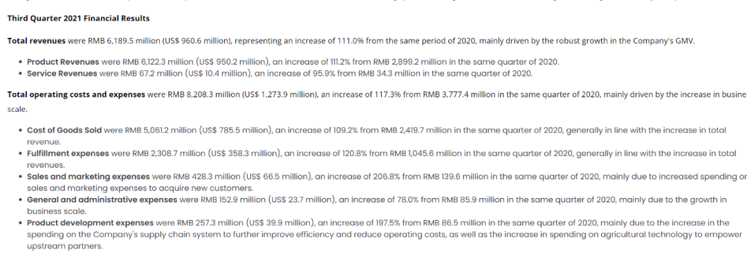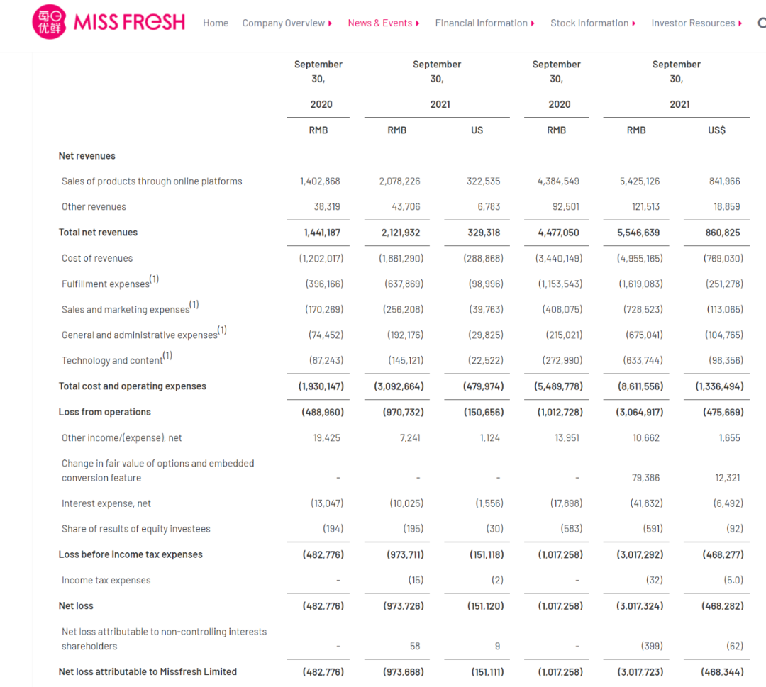 財(cái)報(bào)顯示,每日優(yōu)鮮2021 年Q3的運(yùn)營(yíng)虧損為9.707 億元(約合1.507 億美元),而 2020 年同期虧損4.890 億元。