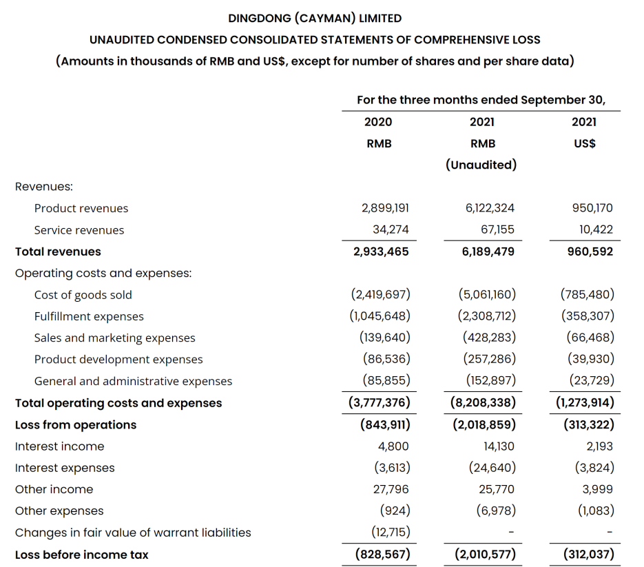 叮咚買菜虧損要比每日優(yōu)鮮多。財(cái)報(bào)顯示,叮咚買菜Q3經(jīng)營(yíng)虧損為20.189 億元(約合3.133 億美元),而2020 年同期經(jīng)營(yíng)虧損為8.439 億元。
