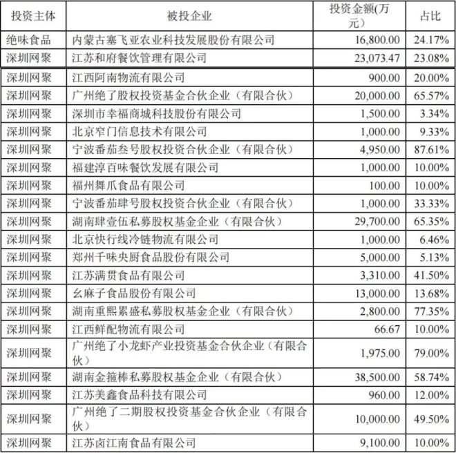 此后,網(wǎng)聚及旗下絕了基金又接連投資了幸福西餅、蛙來(lái)噠、犟骨頭、很久以前、霸蠻等餐飲品牌,以及幺麻子等后端產(chǎn)業(yè)鏈企業(yè),甚至還包括窄門(mén)等數(shù)據(jù)平臺(tái)。而直接以絕味食品投資的預(yù)制菜企業(yè)千味央廚,則于今年9月在深交所上市……