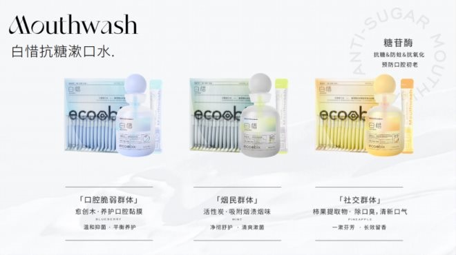 目前,白惜漱口水已經(jīng)推出面向口腔脆弱群體(藍(lán)莓口味)、煙民群體(薄荷口味)、社交群體(鳳梨口味)三款產(chǎn)品。除了通過糖苷酶實(shí)現(xiàn)抗糖、防蛀、抗氧化功效,三款漱口水,還分別加入了愈創(chuàng)木提取物、活性炭、柿果提取物來達(dá)到養(yǎng)護(hù)口腔黏膜、吸附煙漬煙味、除口臭清新口氣的功效。