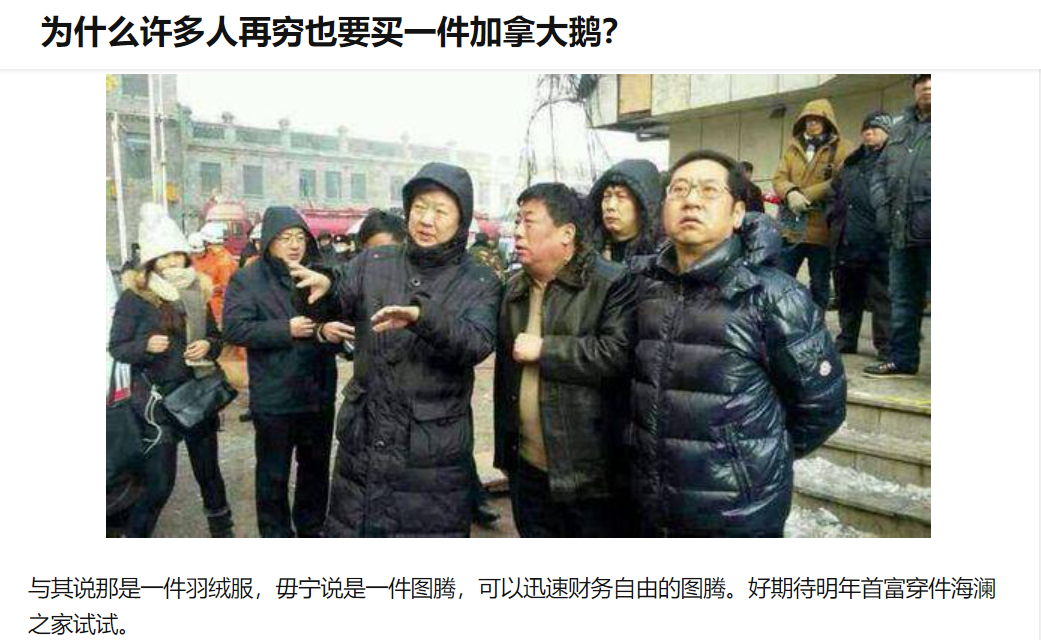在知乎“為什么許多人再窮也要買一件加拿大鵝?”問題下,有網(wǎng)友的評(píng)論巧妙地印證了這一點(diǎn):“與其說那是一件羽絨服,毋寧說是一件圖騰,可以迅速財(cái)務(wù)自由的圖騰!