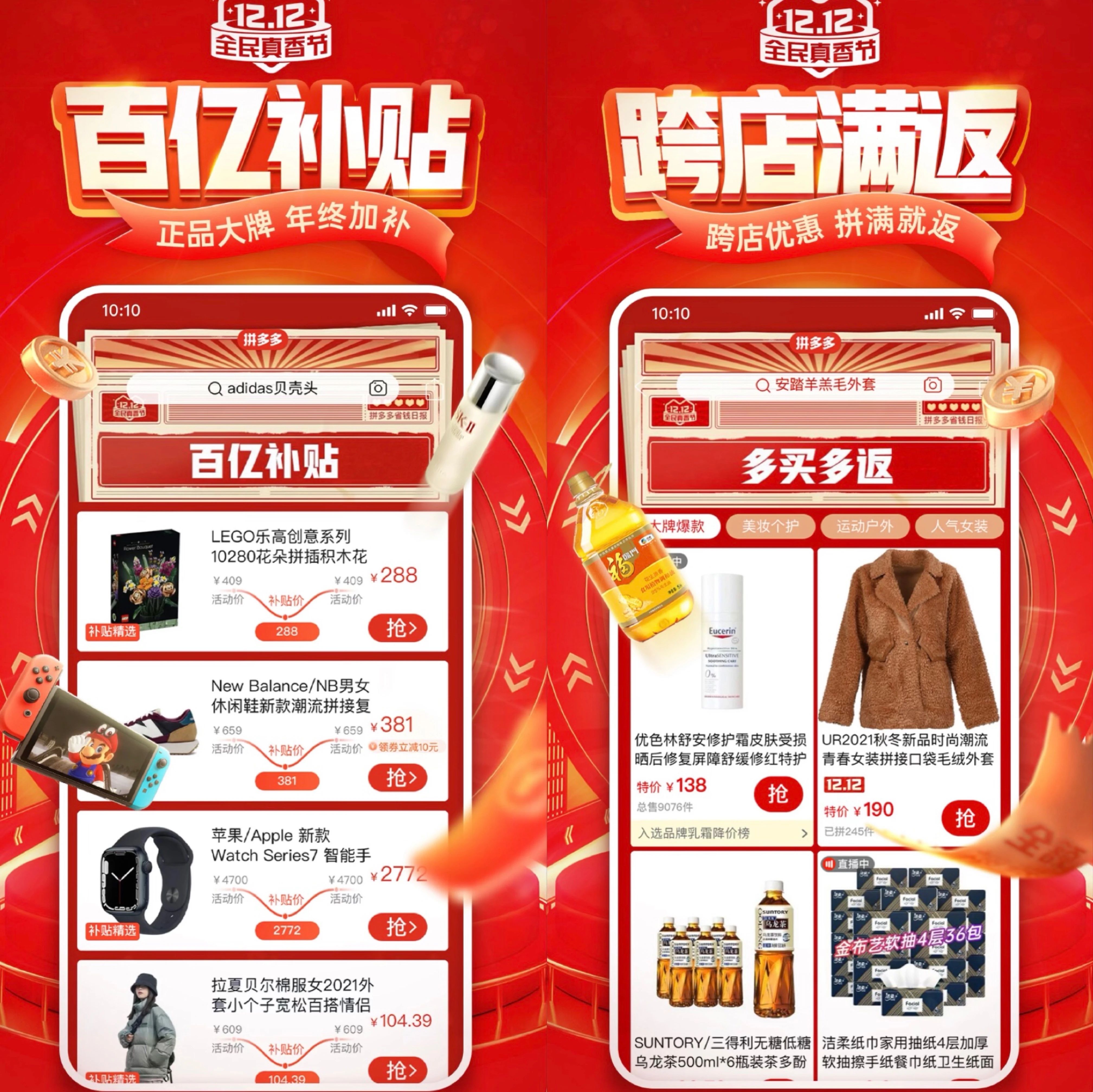 從具體玩法來看,拼多多一直主打的低價(jià)、百億補(bǔ)貼、團(tuán)購都包含其中,特別是補(bǔ)貼、降價(jià)都排在了雙12大促界面專區(qū)前列。針對手機(jī)和數(shù)碼產(chǎn)品品類,拼多多直接給出直降后的“真香底價(jià)”,iPhone最高降價(jià)1200元的信息被列在最醒目處;食品、水果生鮮、服飾等其他品類大多都是拼單優(yōu)惠和品類優(yōu)惠券、店鋪優(yōu)惠券疊加,同時(shí)還可享受跨店滿減的優(yōu)惠。
