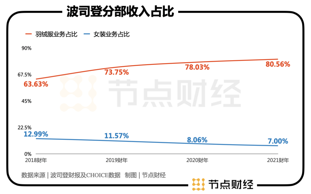而在羽絨服越賣越好的同時,曾被波司登給予厚望的女裝業(yè)務(wù)卻行進在下滑通道中。
