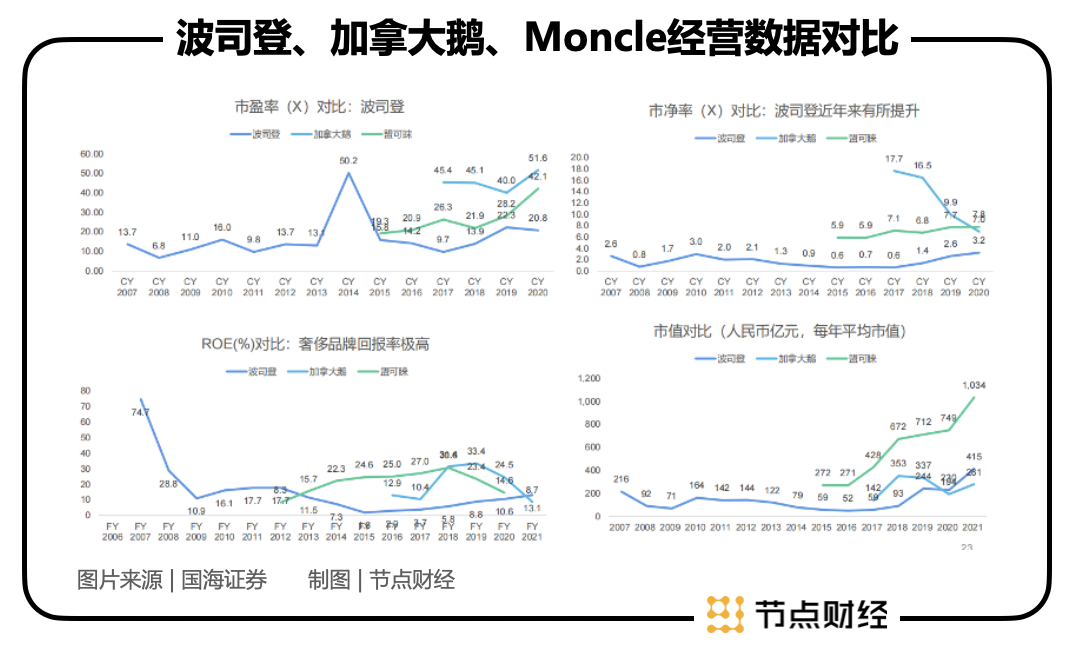 如上圖所示,加拿大鵝、Moncle、波司登同場競技,前兩者的市盈率均在波司登之上。經(jīng)節(jié)點財經(jīng)研究,加拿大鵝和Moncle作為全球范圍內(nèi)公認的頂尖羽絨服品牌,享受的是奢侈品的估值邏輯,波司登則是按照紡織業(yè)來估值。孰高孰低,資本心里有桿秤。