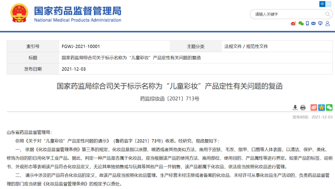12月3日,國(guó)家藥監(jiān)局發(fā)布了一則《國(guó)家藥監(jiān)局綜合司關(guān)于標(biāo)示名稱為“兒童彩妝”產(chǎn)品定性有關(guān)問(wèn)題的復(fù)函》,對(duì)于“兒童彩妝”產(chǎn)品定性問(wèn)題作出了回應(yīng)。