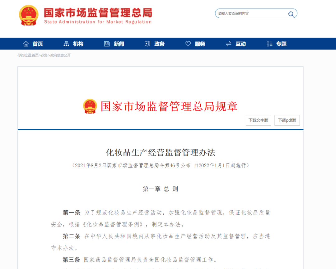 今年8月6日,國(guó)家市場(chǎng)監(jiān)督管理總局發(fā)布了《化妝品生產(chǎn)經(jīng)營(yíng)監(jiān)督管理辦法》(以下簡(jiǎn)稱《辦法》)。這是我國(guó)首部專(zhuān)門(mén)針對(duì)化妝品生產(chǎn)經(jīng)營(yíng)管理的部門(mén)規(guī)章,也是新條例最為重要的配套文件之一,將于2022年1月1日起正式實(shí)行。