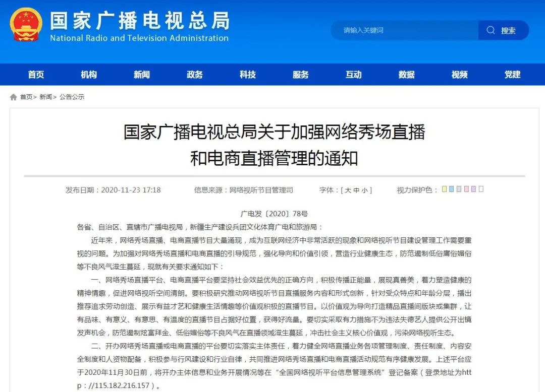 值得關注的是,今年11月23日,國家廣播電視總局發(fā)布關于加強網絡秀場直播和電商直播管理的通知(下稱通知),不僅要求網絡秀場直播平臺對網絡主播和“打賞”用戶實行實名制管理,同時還專門對頭部主播的監(jiān)管提出了要求。