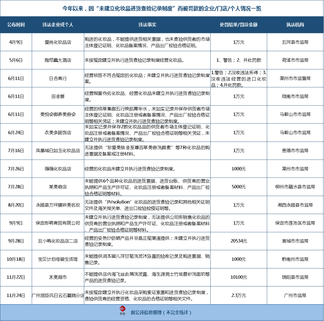 然而,雖然是基本要求,但包括屈臣氏在內(nèi),仍有很多化妝品店制度不健全,從而被監(jiān)管部門(mén)處罰。青眼發(fā)現(xiàn),今年以來(lái),各地方監(jiān)管部門(mén)對(duì)于化妝品店/企業(yè)是否建立了進(jìn)貨查驗(yàn)制度的檢查力度明顯收緊。據(jù)青眼不完全統(tǒng)計(jì),截至目前,今年以來(lái)一共有15家化妝門(mén)店/企業(yè),因無(wú)法提供所經(jīng)營(yíng)的化妝品的供貨商營(yíng)業(yè)執(zhí)照和產(chǎn)品生產(chǎn)許可證、化妝品注冊(cè)或者備案材料、產(chǎn)品出廠檢驗(yàn)合格證明等材料,以及未建立并執(zhí)行進(jìn)貨查驗(yàn)記錄制度經(jīng)營(yíng)化妝品而被罰款。其中,罰款金額最高的即為上述廣州屈臣氏白云石夏路分店。