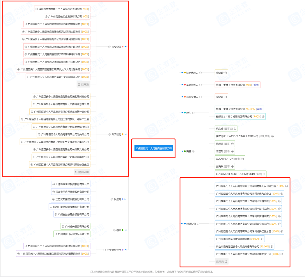 公開(kāi)資料顯示,廣州屈臣氏公司成立于1994年,注冊(cè)資本為7160萬(wàn)港元(約合人民幣5851萬(wàn)元),法定代表人為倪文玲。公司經(jīng)營(yíng)范圍包括醫(yī)用口罩零售、眼鏡銷(xiāo)售(不含隱形眼鏡)、第二類(lèi)醫(yī)療器械銷(xiāo)售、美發(fā)飾品銷(xiāo)售、日用品銷(xiāo)售、化妝品批發(fā)等。根據(jù)企查查信息,廣州屈臣氏旗下有18家控股企業(yè)、17個(gè)對(duì)外投資企業(yè),以及711家分支機(jī)構(gòu),該公司最大股東和實(shí)際控制人為格渥(香港)投資有限公司。