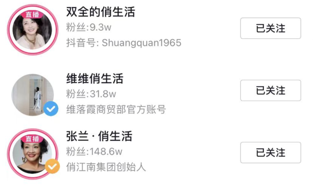 張?zhí)m的吸粉和帶貨能力有多強(qiáng),對比一同“出道”的名媛姐妹就知道了。這就要提到張?zhí)m“抖音生涯”的一段小插曲。她最早是和“雙全”“維維”一起“組合出道”,共同參與一個賬號,合作期不長,三人各自單飛。此后張?zhí)m的個人賬號粉絲高速增長,“雙全”和“維維”的賬號不論是粉絲數(shù)量和帶貨成績,都遠(yuǎn)遠(yuǎn)不及她。