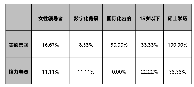 從兩家公司年報批露的信息看,美的集團高管相對偏年輕化,平均年齡為50.3歲,而格力電器高管平均年齡則為54.3歲。在高管總?cè)藬?shù)中,女性高管、數(shù)字化背景、國際化密度、年輕化(45歲以下)、碩士以上學(xué)歷等數(shù)量占比中,美的集團管理團隊更具優(yōu)勢(表1)。