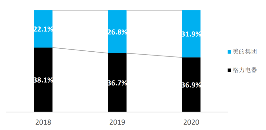 作為家電行業(yè)巨頭,格力電器已連續(xù)26年領(lǐng)跑國內(nèi)家用空調(diào)市場。根據(jù)華泰證券研究所數(shù)據(jù),2020年格力空調(diào)市場份額為36.9%(圖1)。但是,格力在空調(diào)領(lǐng)域的優(yōu)勢正面臨美的集團的強勁挑戰(zhàn)。美的以31.9%的市場份額位居第二。不僅如此,美的集團市值已接近7000億元,而格力電器僅3726億元。在本次組織生命力榜單中,美的集團是唯一一家進(jìn)入前20強的家電企業(yè)。