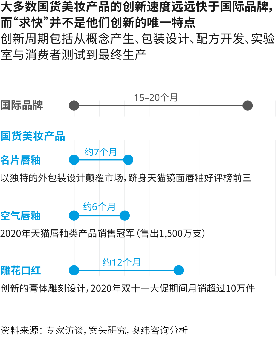 奧緯咨詢通過(guò)專家訪談、行業(yè)調(diào)研發(fā)現(xiàn),國(guó)際大牌單一新品的研發(fā)周期(包括產(chǎn)品創(chuàng)意、包裝設(shè)計(jì)、配方調(diào)配、測(cè)試生產(chǎn))在15-24個(gè)月之間,而同類中國(guó)品牌一般只需要6-9個(gè)月。大牌企劃期往往以年為單位,但中國(guó)品牌以月為單位很是常見(jiàn)。