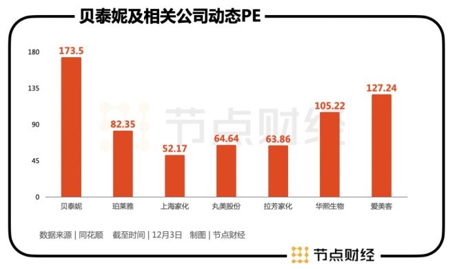 從估值角度看,即便目前貝泰妮已回撤超過30%,其173.5倍(12月3日)的動態(tài)PE仍顯得有些高。相比之下,A股其他化妝品公司如珀萊雅、上海家化、完美股份等目前估值均在100以下。稍微擴展一下,隔壁同樣被資本市場寄予厚望的醫(yī)美概念股如華熙生物、愛美客等,其動態(tài)PE也和貝泰妮有一定的差距。