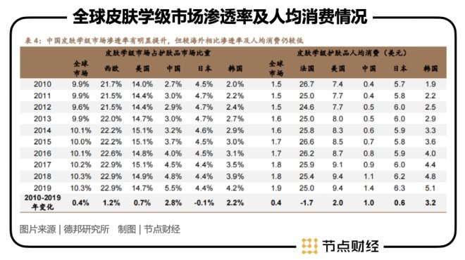 在市場滲透率方面,2019 年中國皮膚學級護膚市場滲透率僅為5.5%,低于全球的 10.3%,更低于歐美等發(fā)達國家。