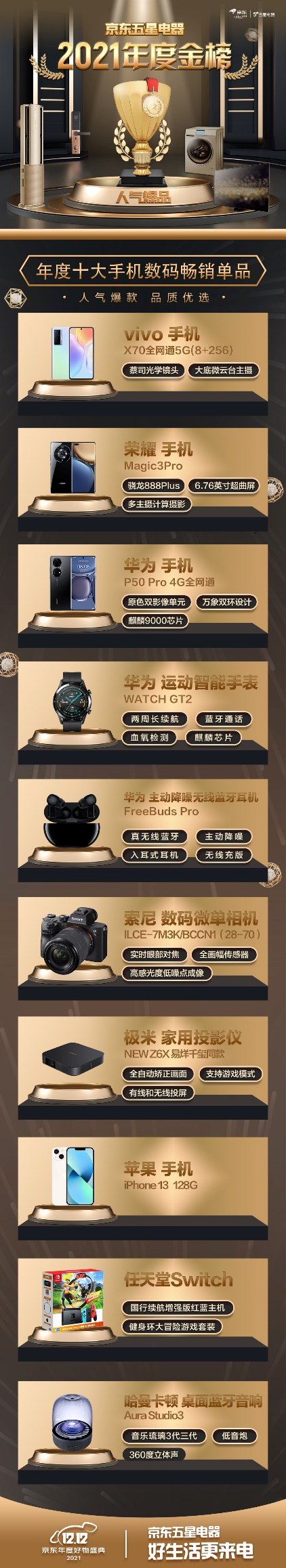 近期,手機新品頻繁登上熱搜榜。榮耀60系列、OPPO Reno7系列、華為Nova9系列……京東五星電器、京東電器門店也成為大家嘗鮮的首選渠道。在京東五星電器發(fā)布的暢銷榜單上,蘋果13、vivo手機X70、榮耀Magic3Pro、華為P50 Pro、華為運動智能手表WATCH GT2、華為主動降噪無線藍牙耳機FreeBuds Pro、極米家用投影儀、任天堂Switch,等等都入選其中,讓各類消費人群選擇起來都毫不費力。
