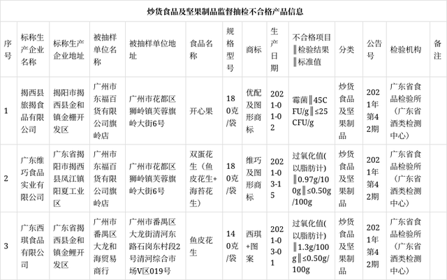 12月2日,廣東省市場監(jiān)督管理局網(wǎng)站發(fā)布2021年第42期食品抽檢信息。本次抽檢炒貨食品及堅果制品主要為開心果、其他炒貨食品及堅果制品,不合格樣品3批次,不合格項目為霉菌、過氧化值(以脂肪計)。