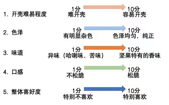 根據(jù)堅果類產(chǎn)品感官評價的熱詞,設(shè)置了多個維度,從開殼難易程度、色澤、味道、口感以及整體喜好度進(jìn)行評分。