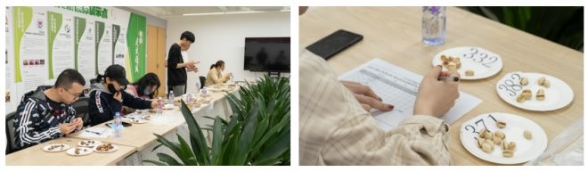 在主觀測評環(huán)節(jié),碧根果、夏威夷果、松子、開心果4個品類,每品類3款,共12款堅果放進(jìn)相同的容器中,按照隨機數(shù)字表進(jìn)行編碼。