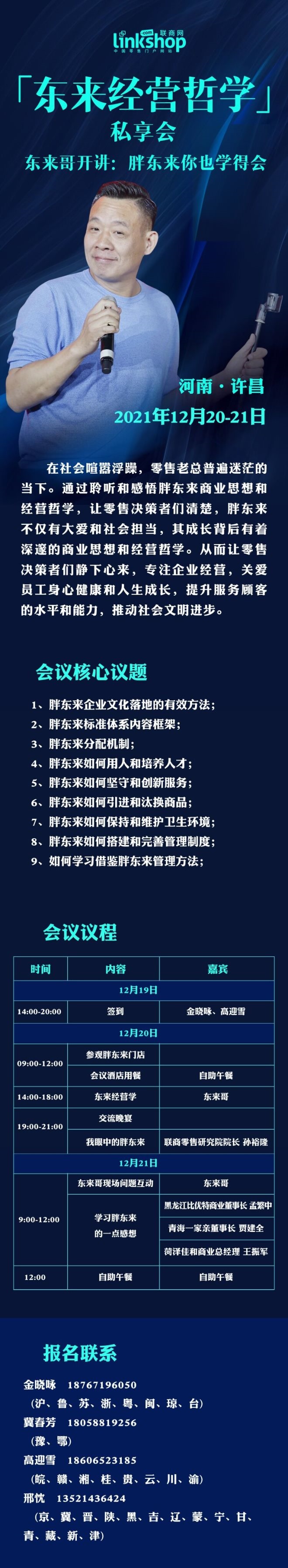 12月20日,東來經(jīng)營哲學(xué)私享會將在許昌開辦,于東來將親自分享,暢談商業(yè)邏輯。歡迎報(bào)名參加。