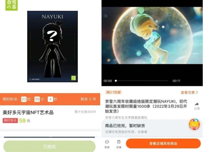 首先,關于“潮玩”方面,截至發(fā)稿前,奈雪在其官方微博中先后發(fā)文表示,今日12:07分正式發(fā)行的300個NFT數(shù)字藝術(shù)品系列《創(chuàng)造美好》作品,1秒全部售罄;全球限量1000套「NAYUKI」也已經(jīng)全部售罄。