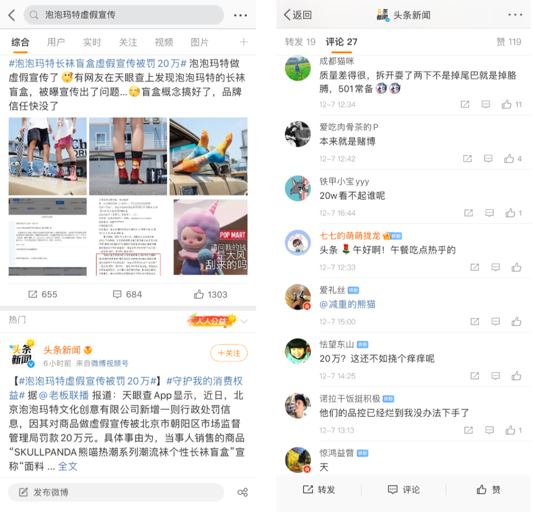 “他們的品控已經(jīng)爛到我沒辦法下手了!12月7日,泡泡瑪特長襪盲盒因虛假宣傳被罰20萬元的新聞引發(fā)網(wǎng)友熱議。