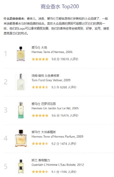 在國內(nèi)香水消費(fèi)者較為集中的平臺“香水時代”上,根據(jù)消費(fèi)者評分出具的商業(yè)香排行榜單TOP5分別是大地、灰色香根草、尼羅河花園、大地香精版、香根魅力,這五款香水的香調(diào)都屬于較為淡雅的柑橘、花香、果香、木質(zhì),其中三款香水出自同一個傳奇調(diào)香師“JCE”之手,但這個作出三款深受國內(nèi)消費(fèi)者喜愛作品的調(diào)香師,到了真正的東方香調(diào)作品又顯得有些捉襟見肘。