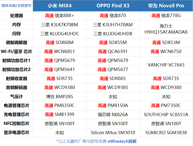 以小米MIX4、OPPO Find X3和華為Nova9 Pro三款國產(chǎn)中高端手機為例,其射頻功放芯片、射頻收發(fā)器、電源管理芯片,Wi-Fi/藍牙芯片以及音頻解碼芯片等元器件均來自高通。
