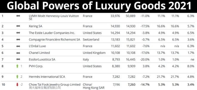 2021全球100大奢侈品公司銷售排行出爐 中國9家上榜