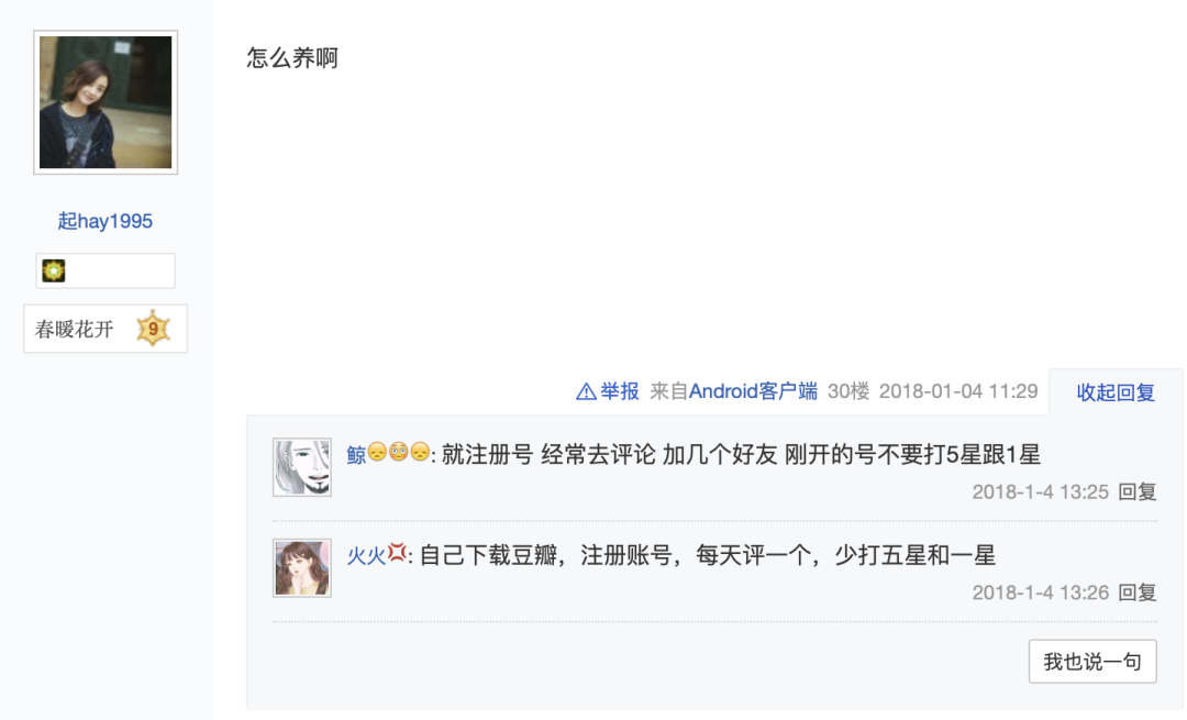 查詢到飯圈流行“養(yǎng)號(hào)”的最早時(shí)間,大約是在2018年初,有粉絲在貼吧中強(qiáng)調(diào)豆瓣養(yǎng)號(hào)的重要性,這則帖子下方,也有粉絲總結(jié)出了養(yǎng)號(hào)的注意事項(xiàng):盡量用手機(jī)號(hào)注冊(cè),注冊(cè)后多加小組,多活躍,盡量多給老片打分,寫(xiě)評(píng)論,不要單純復(fù)制粘貼,可以百度影評(píng),盡量不要給首頁(yè)的新片打分,這樣比較假,可以多給老片打分,這樣可以增加權(quán)重,剛開(kāi)的號(hào)不要打五星或者一星,多打三星和四星等等。