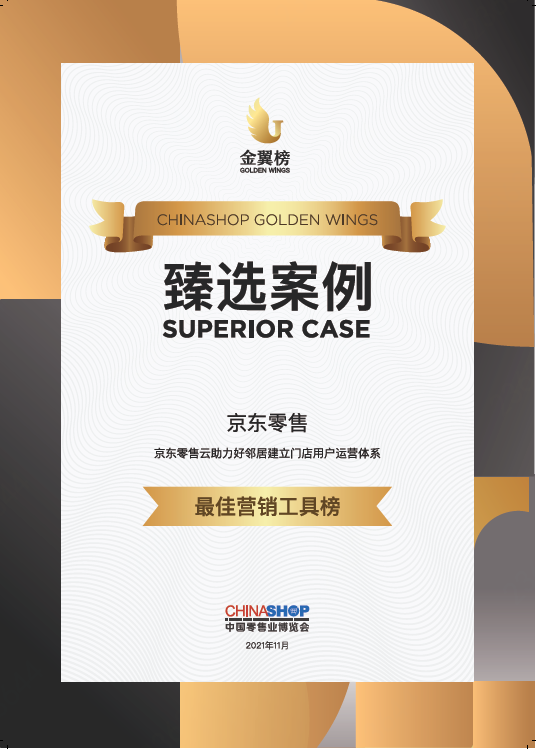 近日,由CHINASHOP主辦的金翼榜臻選案例榜單發(fā)布,“京東零售云助力好鄰居建立門店用戶運營體系”案例從130余個優(yōu)秀案例中脫穎而出,榮獲甄選案例大獎。