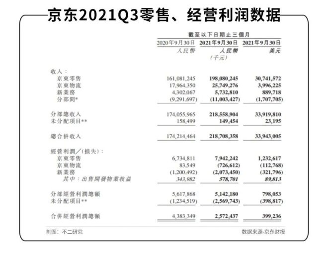 據(jù)財報顯示,2021年第三季度,京東零售實現(xiàn)收入1980.80億元,經(jīng)營利潤為79.42億元,同比增長18%,是三大業(yè)務(wù)中唯一盈利的業(yè)務(wù),但經(jīng)營利潤率僅為4.01%。