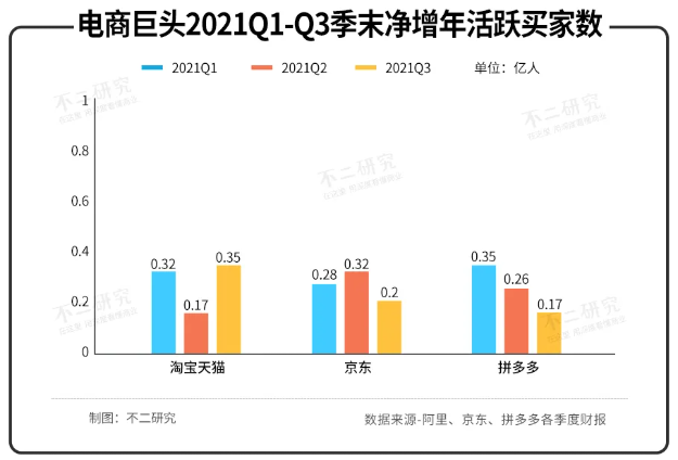 據(jù)財報顯示,阿里、京東和拼多多2021年前三季度的季末凈增年活躍買家數(shù)量分別為0.84億、0.80億和0.78億人,京東年活躍用戶增長數(shù)處于中位。