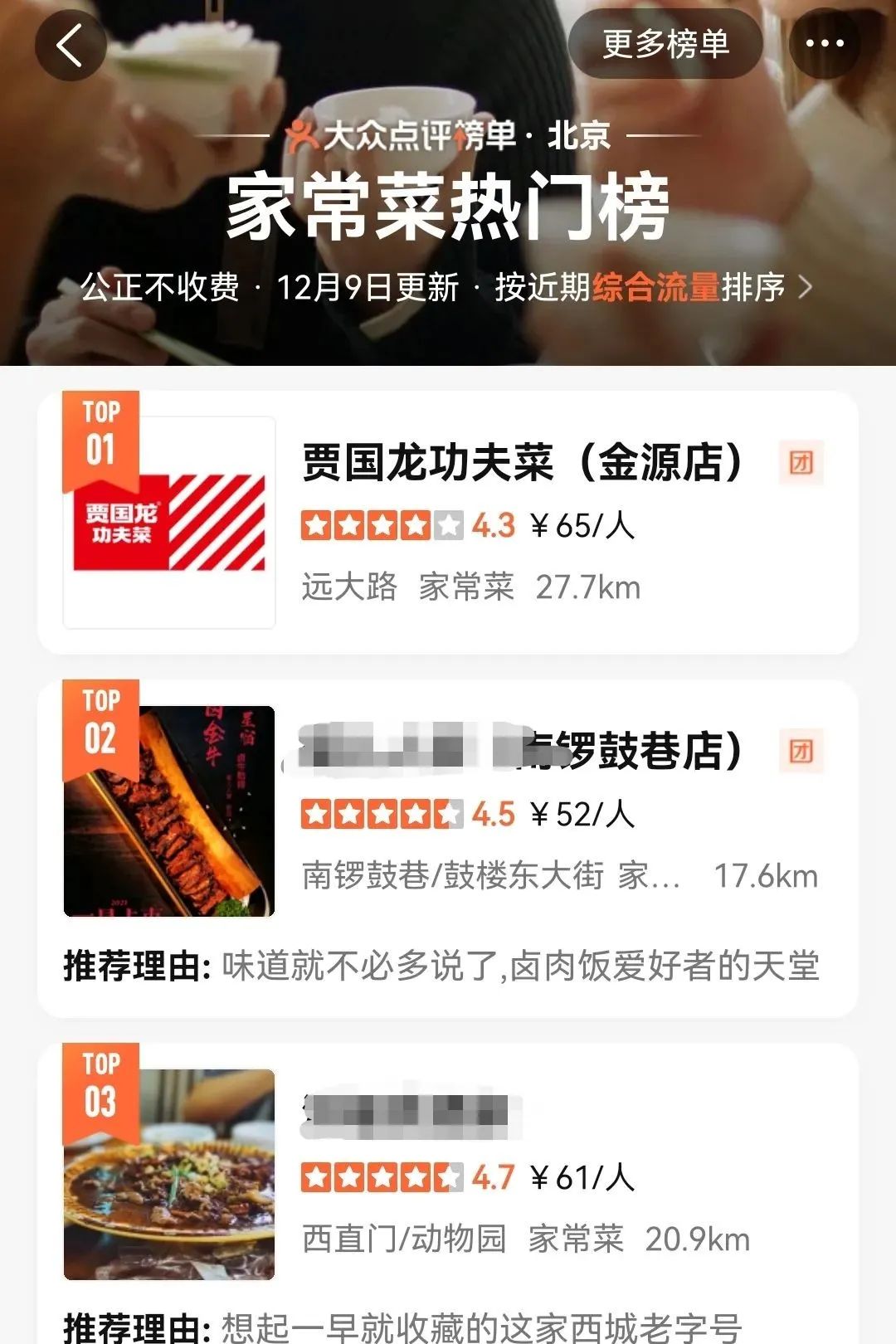 目前,這家賈國龍功夫菜登上了“海淀區(qū)家常菜熱門榜單”的第一名。