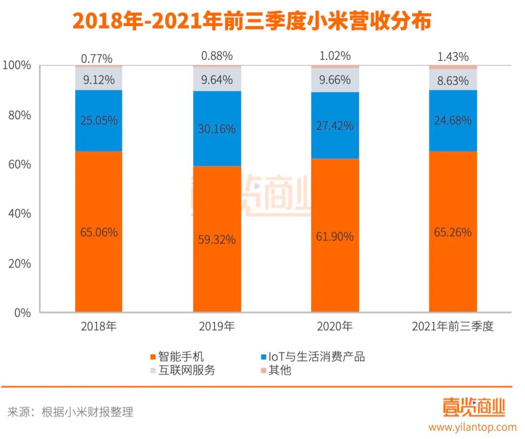 智能手機(jī)、IoT與生活消費產(chǎn)品是小米營收的最大來源,二者合計占據(jù)了小米整體營收的約90%。但從毛利潤角度,2020年及之前,互聯(lián)網(wǎng)服務(wù)一直貢獻(xiàn)著做多的毛利潤,但今年前三季度,智能手機(jī)取代了互聯(lián)網(wǎng)服務(wù)的地位,原因在于小米手機(jī)銷量的增長和單價的提升。